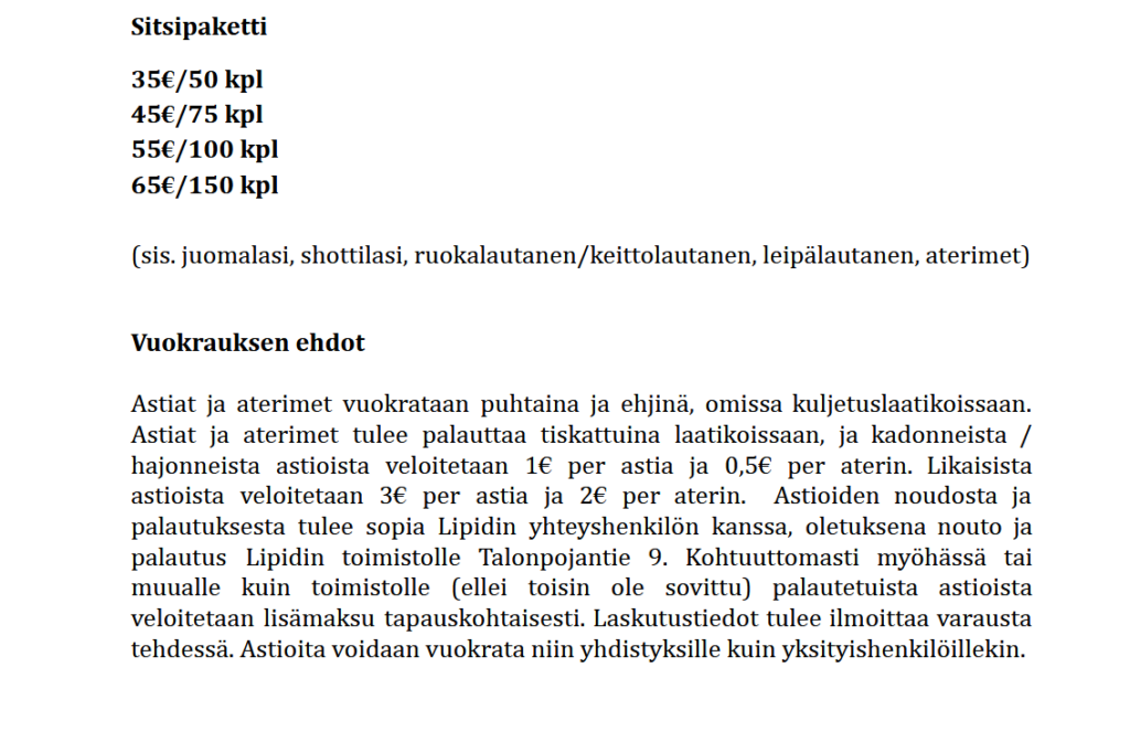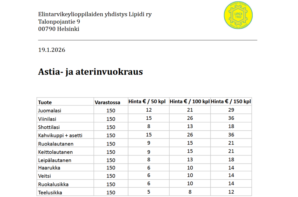 Lipidi ry tarjoaa edulliseen hintaan omaa astiastoaan niin järjestö- kuin yksityiskäyttöön.